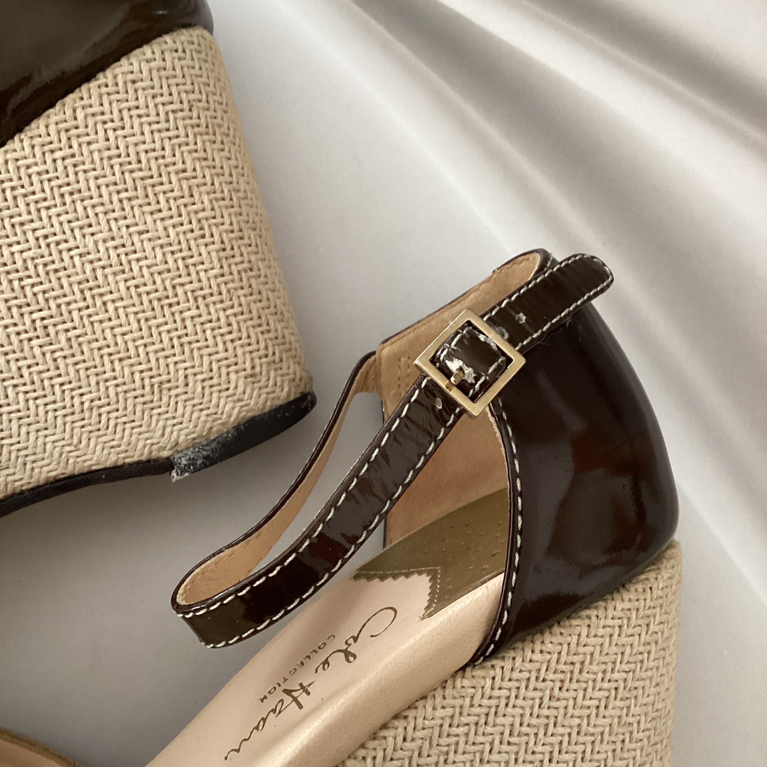 ブラウンのストラップ付きオープントゥサンダル、ウェッジヒールでカジュアルなスタイルに最適。
