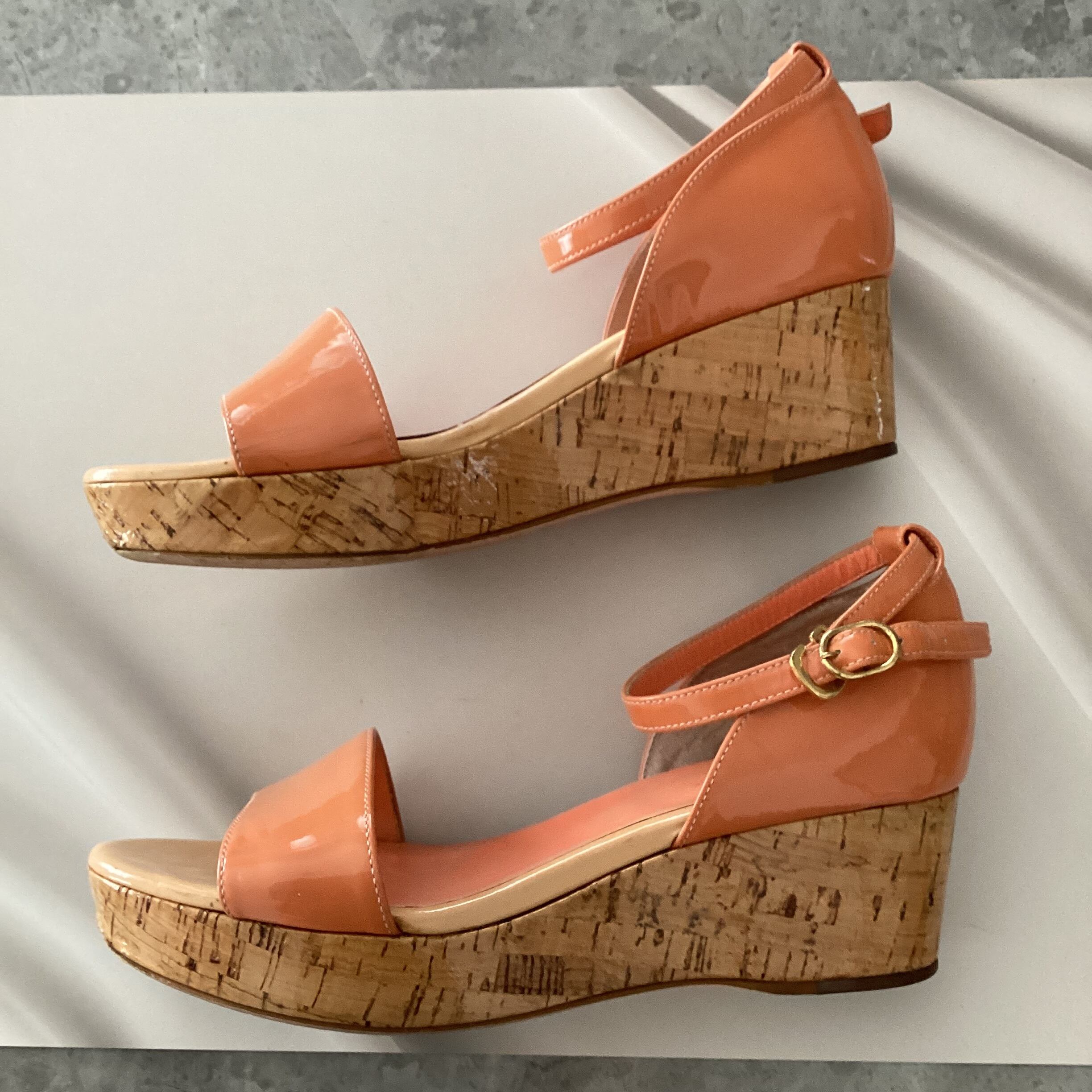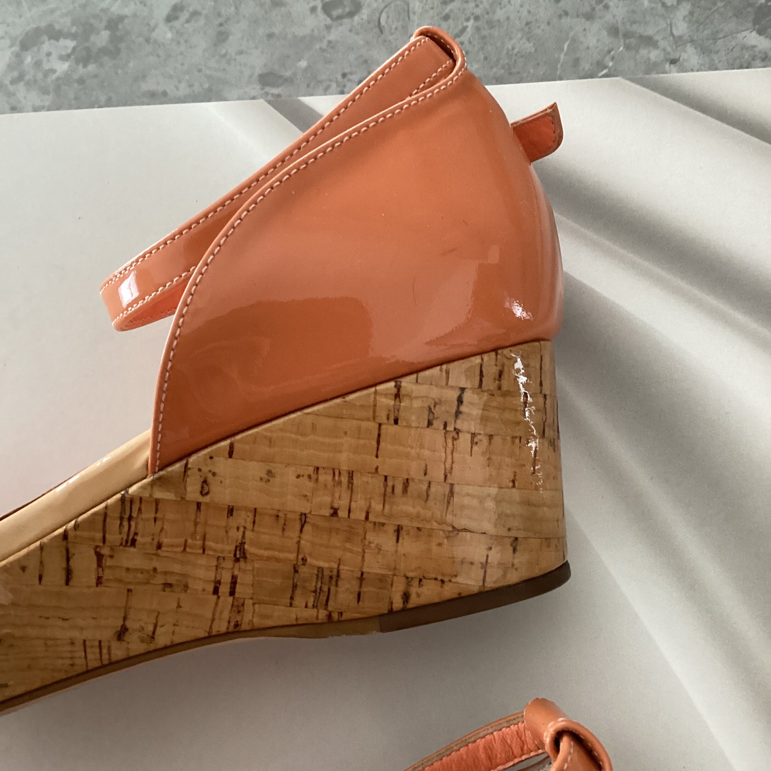 エナメル仕上げのオレンジ色のウェッジサンダル、ストラップ付きでカジュアルなスタイルに最適。